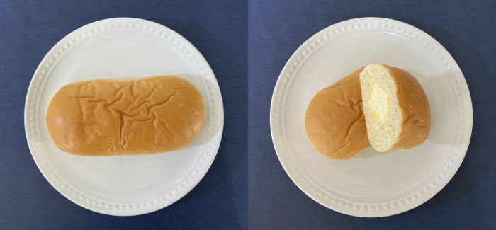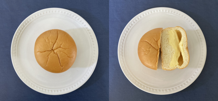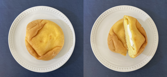 袋に入っていたのに、こんなに綺麗なまん丸、美しいですね。食べるとはみ出るくらいのクリームの量、甘くて柔らかく、しっかりしたパン生地と調和が取れていて、食べ応えがあります。昔ながらの王道なクリームパンって感じで、懐かしくも感じます。今回紹介したクリームパンの中で一番ずっしり感があります(1個95グラム)。そして、さすがカロリーも高いです(1個318キロカロリー)。食べていると至福のひと時を味わえる優れものです。