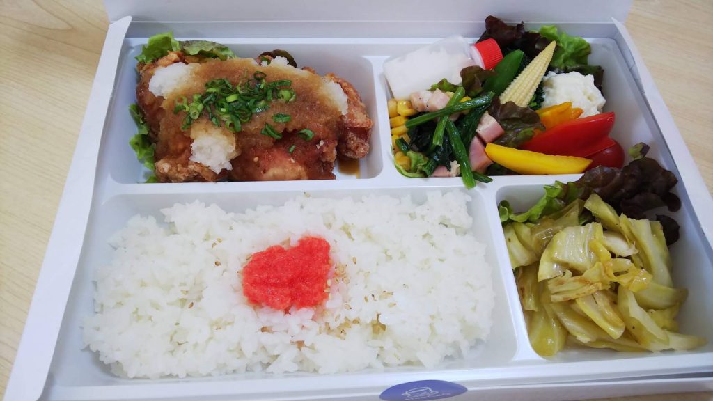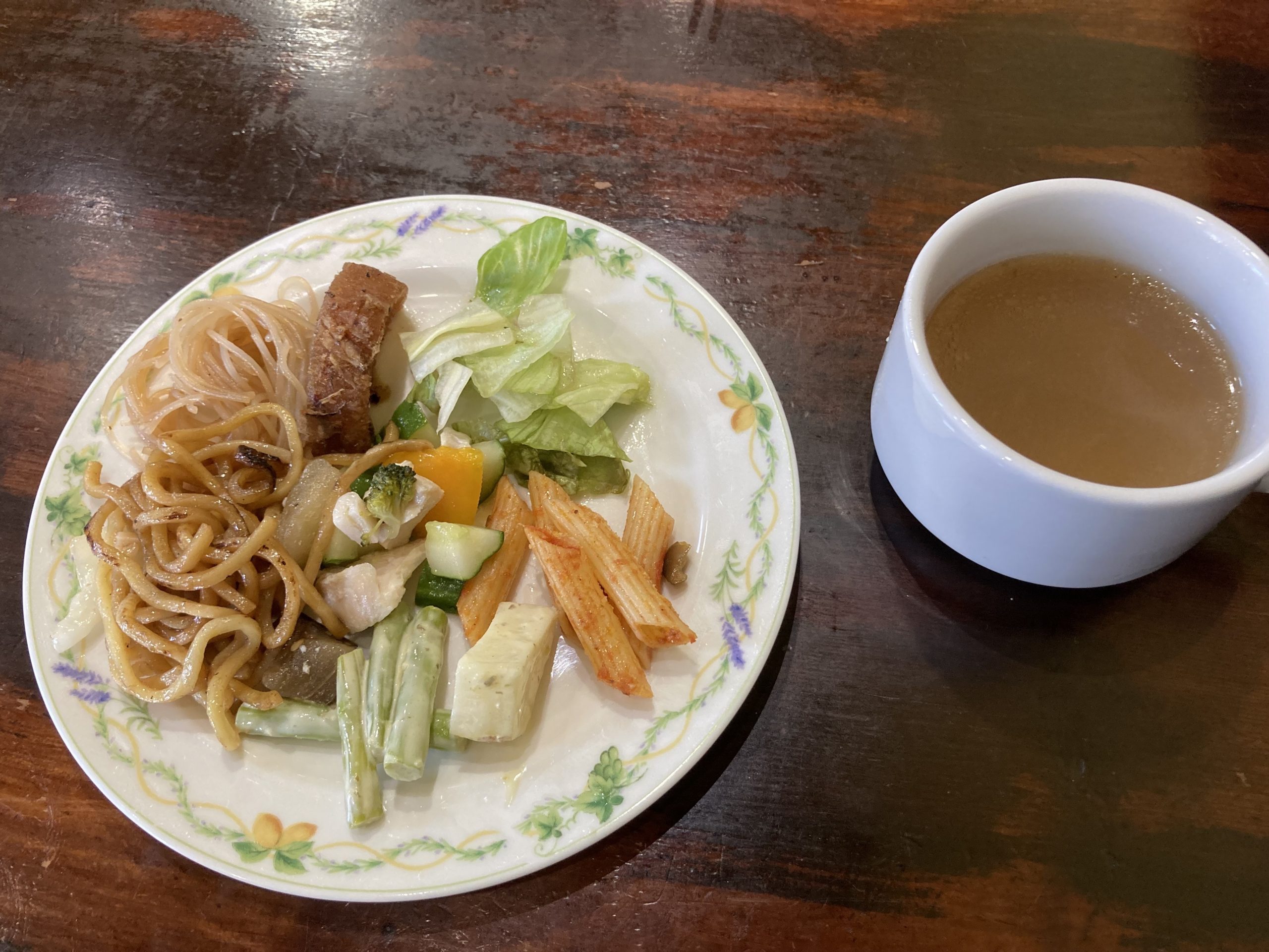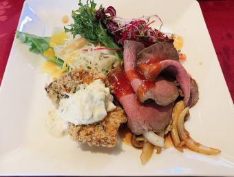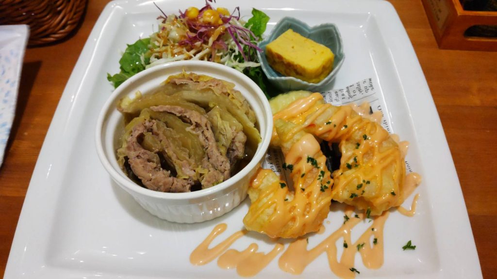 この日の日替わりメニューはローストビーフと魚のフライ。ローストビーフは一口で食べられないくらいの大きさで食べ応えがありました。