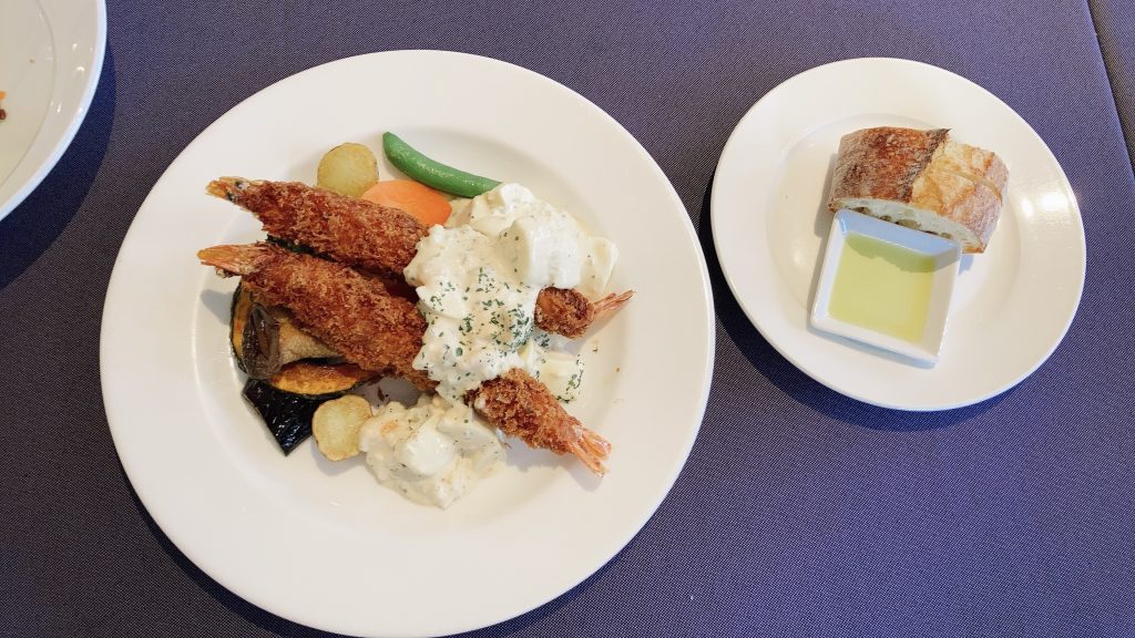 メインは魚料理のエビフライをチョイス。野菜のソテーの上に大きなエビフライ、タルタルソースもたっぷりかかっています。パンかライスは選べます。