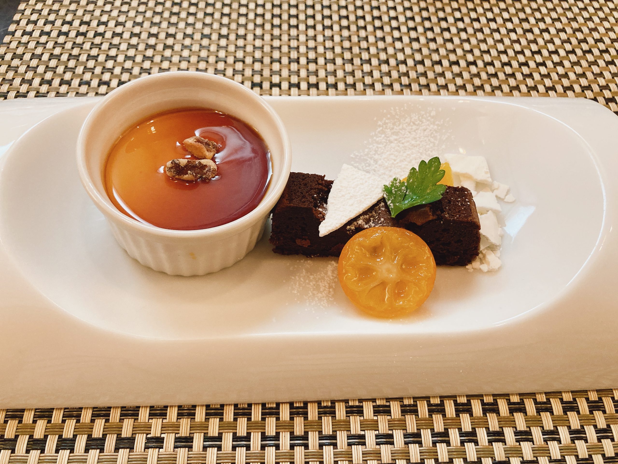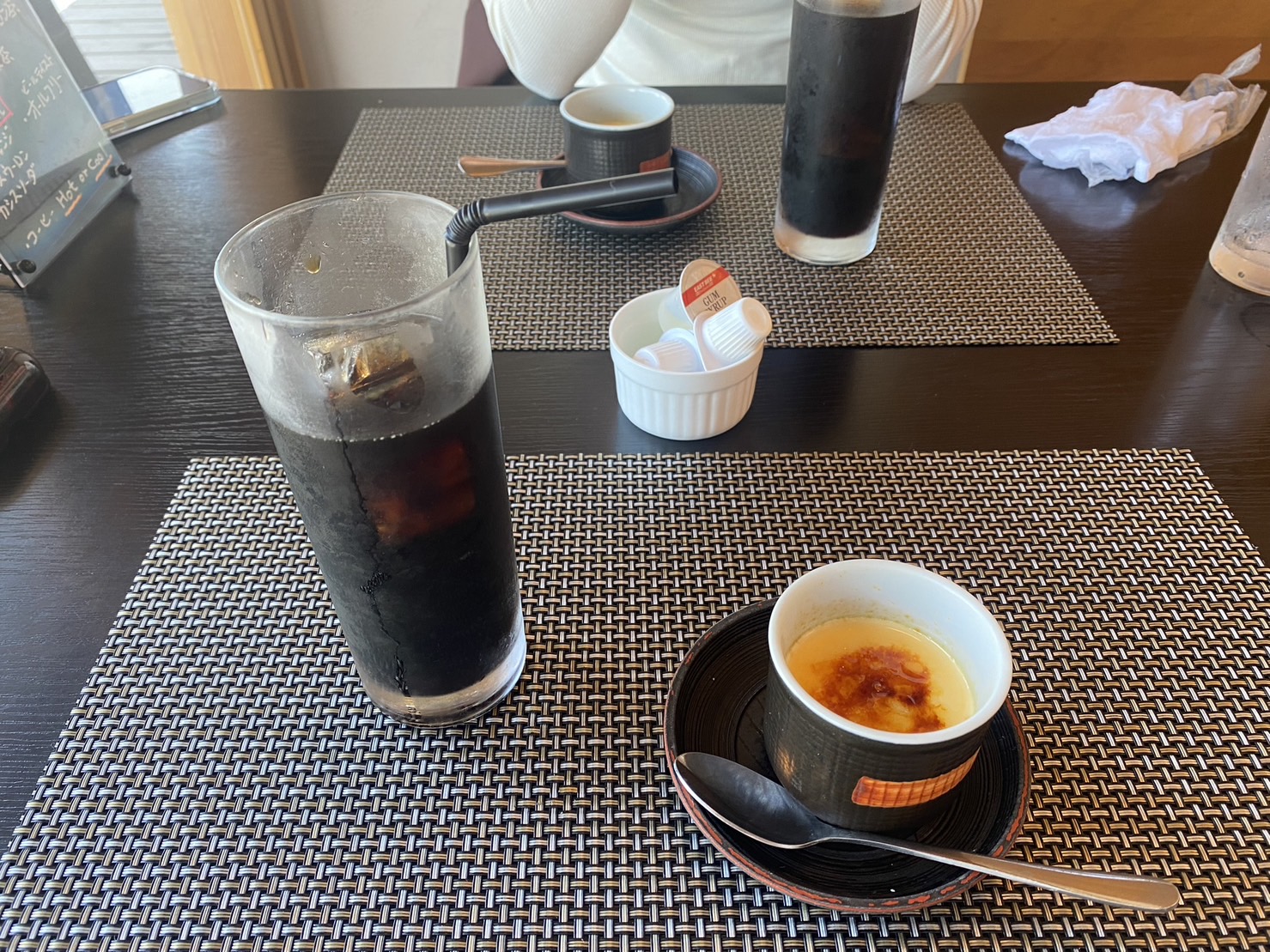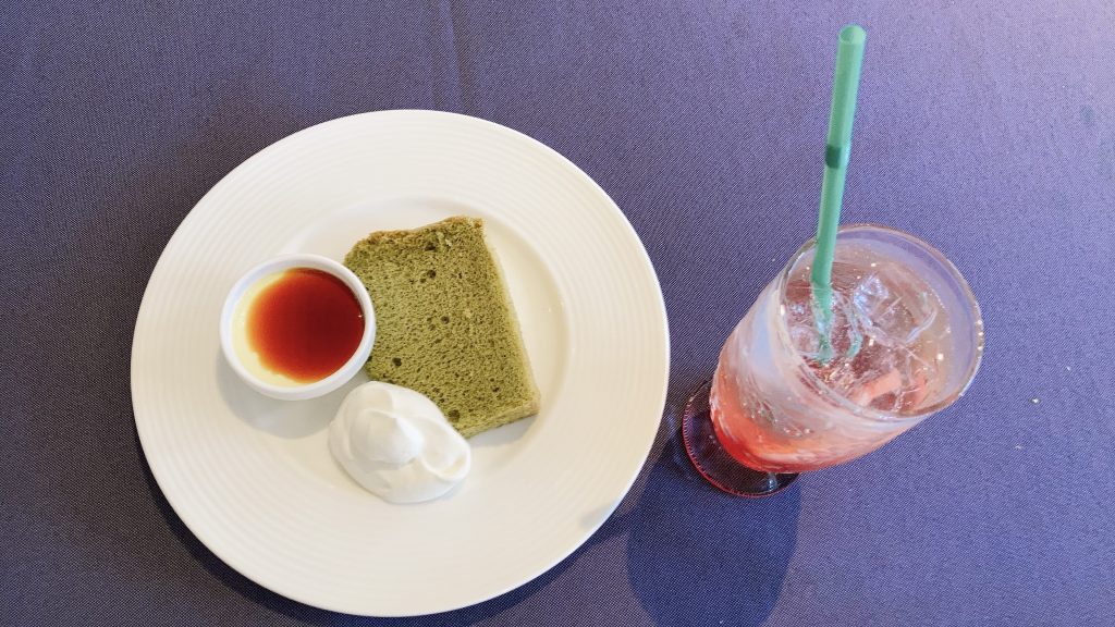 デザートは、濃厚なプリンと抹茶のシフォンケーキ。ドリンクはいちごソーダをチョイス。