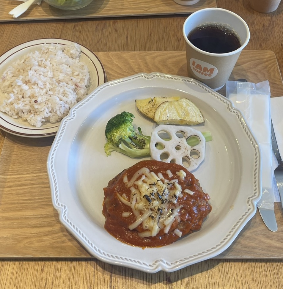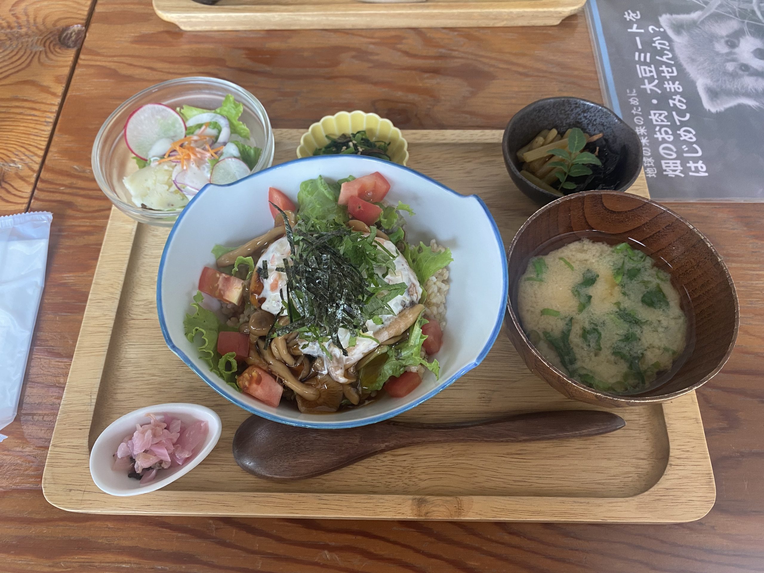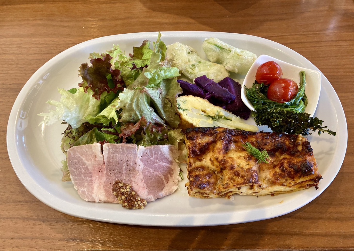 今井書店に併設されたカフェで、彩り豊かなランチプレートを楽しめる。読書や仕事の合間に、ほっと一息つけるランチタイムに最適。