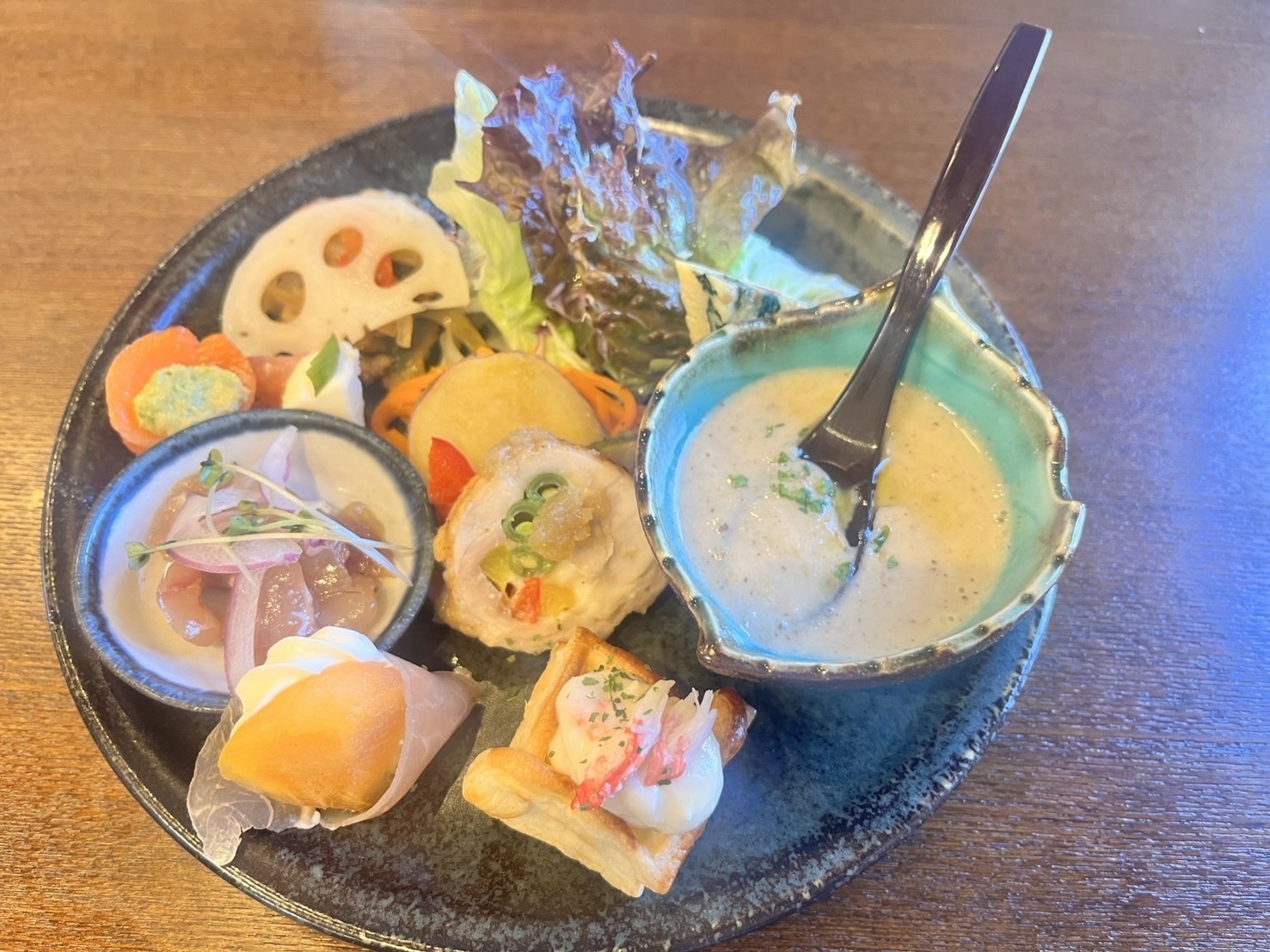 ランチセットメニューには前菜の盛り合わせとドリンクがつきます。
