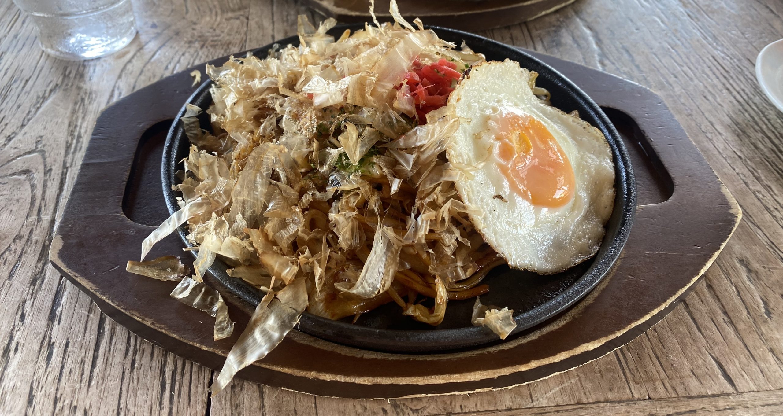 熱々の鉄板の上にとろっとした薄焼き卵、その上にもっちりした太麺のナポリタン。