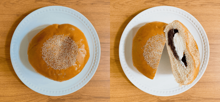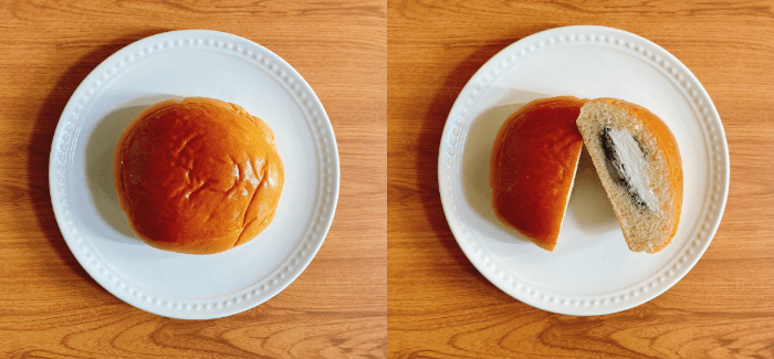 今回のホイップあんぱんの中で唯一ケシの実がしっかり張り付いてます。見た目は普通のあんぱん。ふわふわのパンの中に粒あんもホイップクリームもたっぷり入っているので、ずっしりと重量感があります。粒あんよりホイップクリームは甘め、でもミルク感はしっかり味わえます。1個でお腹いっぱいになりそう。