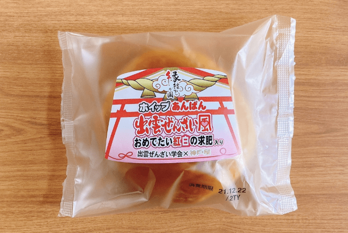出雲をテーマにした菓子パン「縁結びの国シリーズ」として販売されている商品の一つなので、『縁結びの国』『出雲』『おめでたい』『紅白』など、パンのパッケージとは思えない幸せキーワードばかり。ぜひあやかりたいですね。出雲ぜんざい学会と神戸屋のコラボ商品です。興味のある方はぜひ出雲ぜんざい学会のホームページも覗いてみはいかがでしょうか。