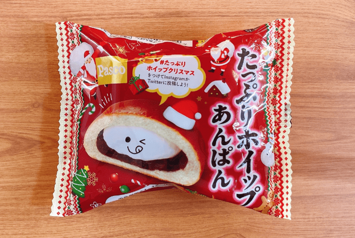 パッケージは、クリスマス限定パッケージ。サンタクロースがいるし、あんぱんはサンタの帽子をかぶっています。クリスマス感いっぱいですね。陳列棚でも一際目立ちます。