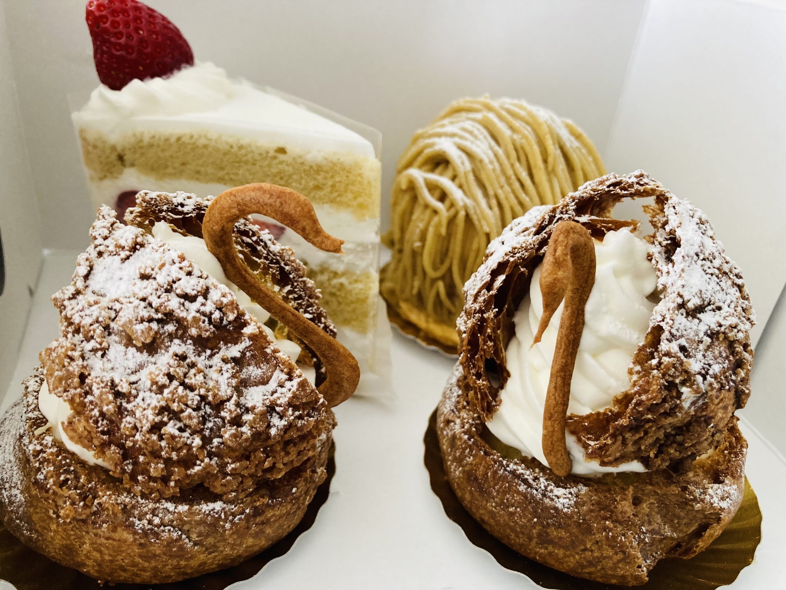 黒い建物が目印の焼き菓子とケーキのお店。コハクチョウの形したシュークリームはおすすめ!