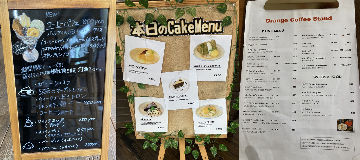 オレンジ色の外観が目印。期間限定パフェやケーキ、ドリンクも充実!